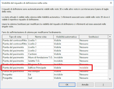 In pratica, per controllare la visibilità di elementi di riferimento (griglie e livelli) e regioni di taglio delle viste, vengono utilizzati i riquadri di definizione.